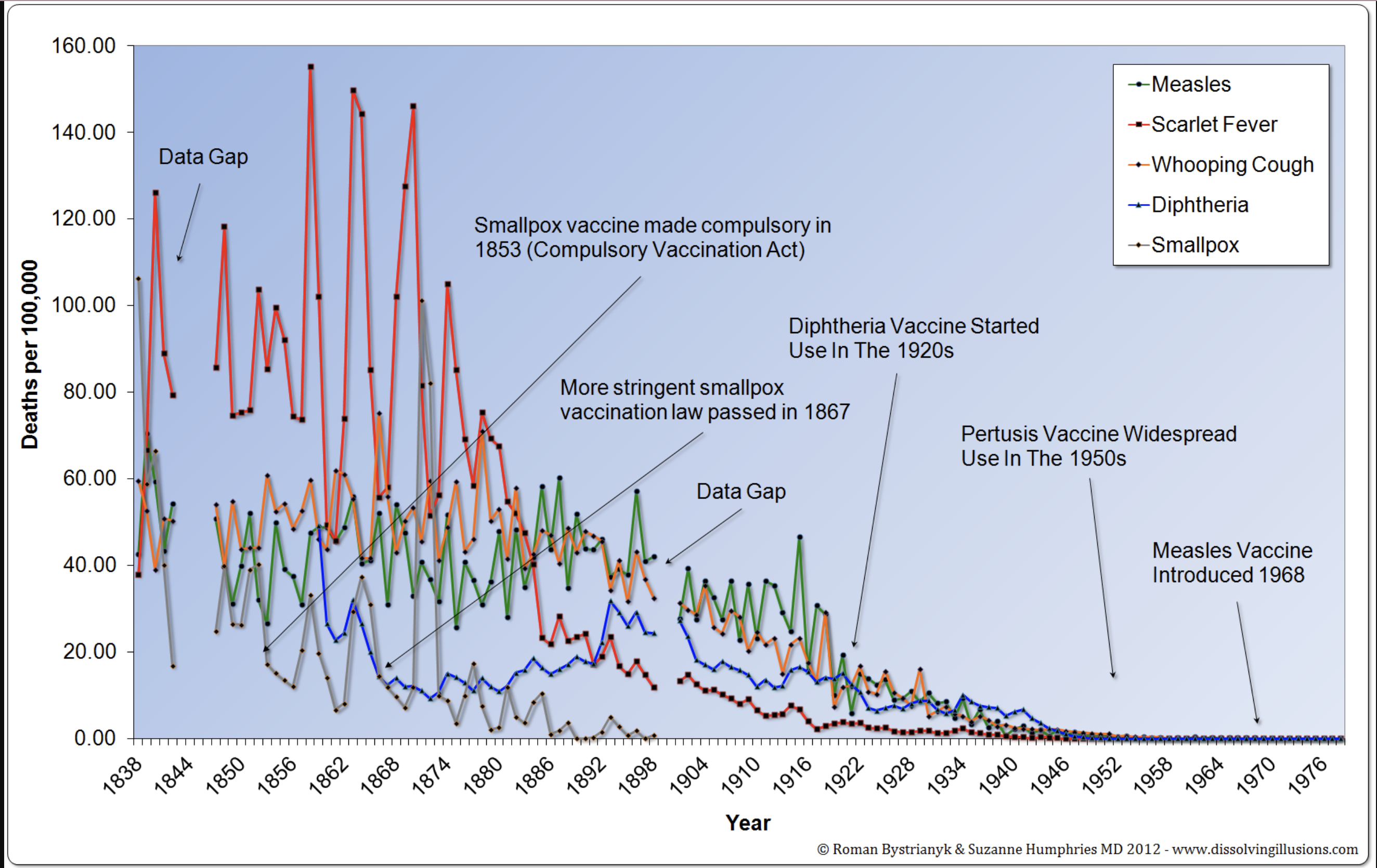 Smallpox is the illness for which vaccines have been around longest. If you look at the graphs for smallpox and note the points during which they were mandatory (it varied, off and on, from place to place), you’ll find that the imposition of mandatory smallpox vaccination generally resulted in a huge INCREASE in smallpox deaths. That’s why the laws see-sawed back and forth between mandatory and voluntary, as populations became rebellious of having smallpox inflicted upon them.